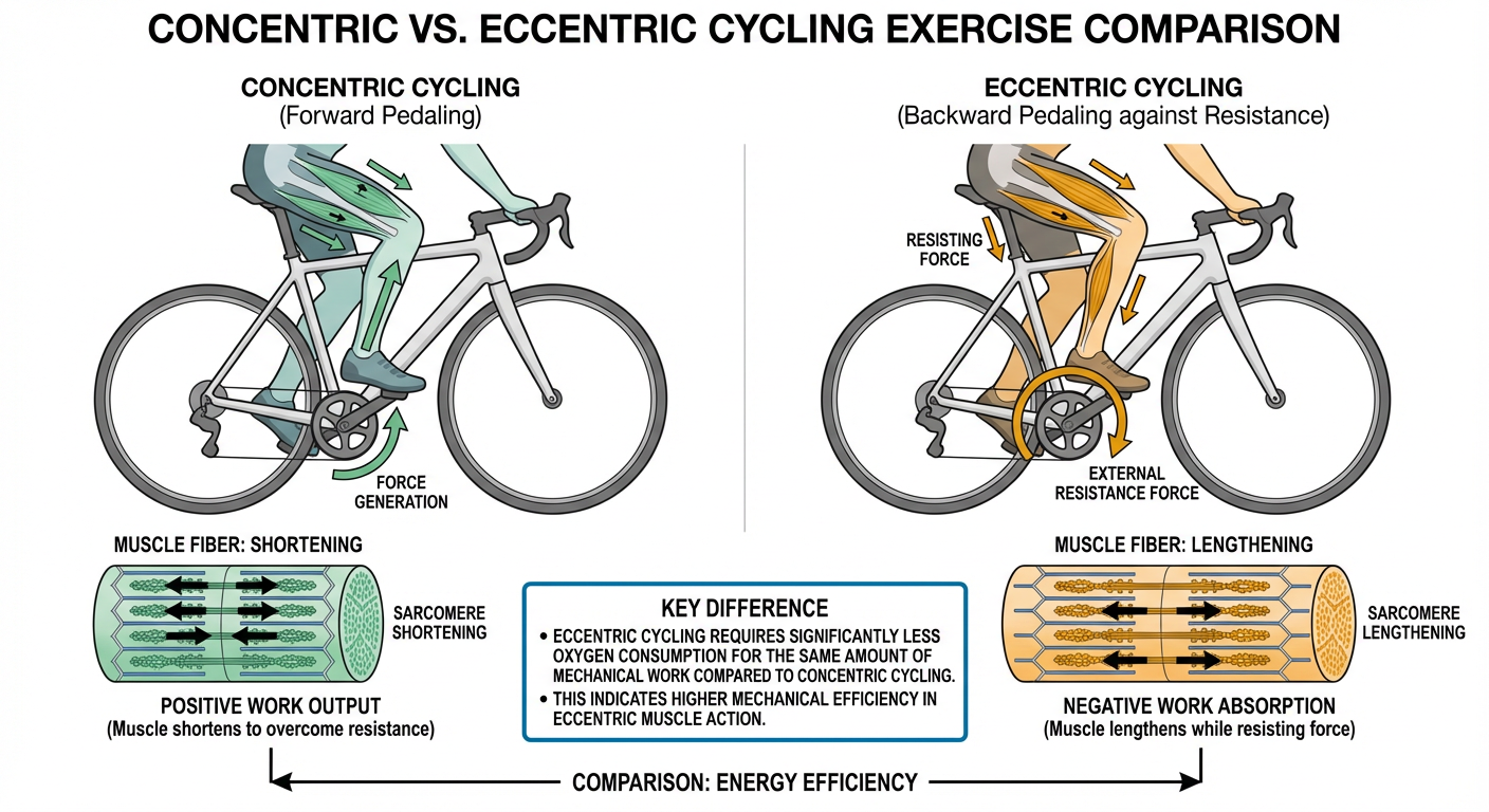 We investigate eccentric muscle contractions—where muscles lengthen under load—as a unique training and rehabilitation modality. Eccentric cycling allows high mechanical work with reduced metabolic cost, making it valuable for: